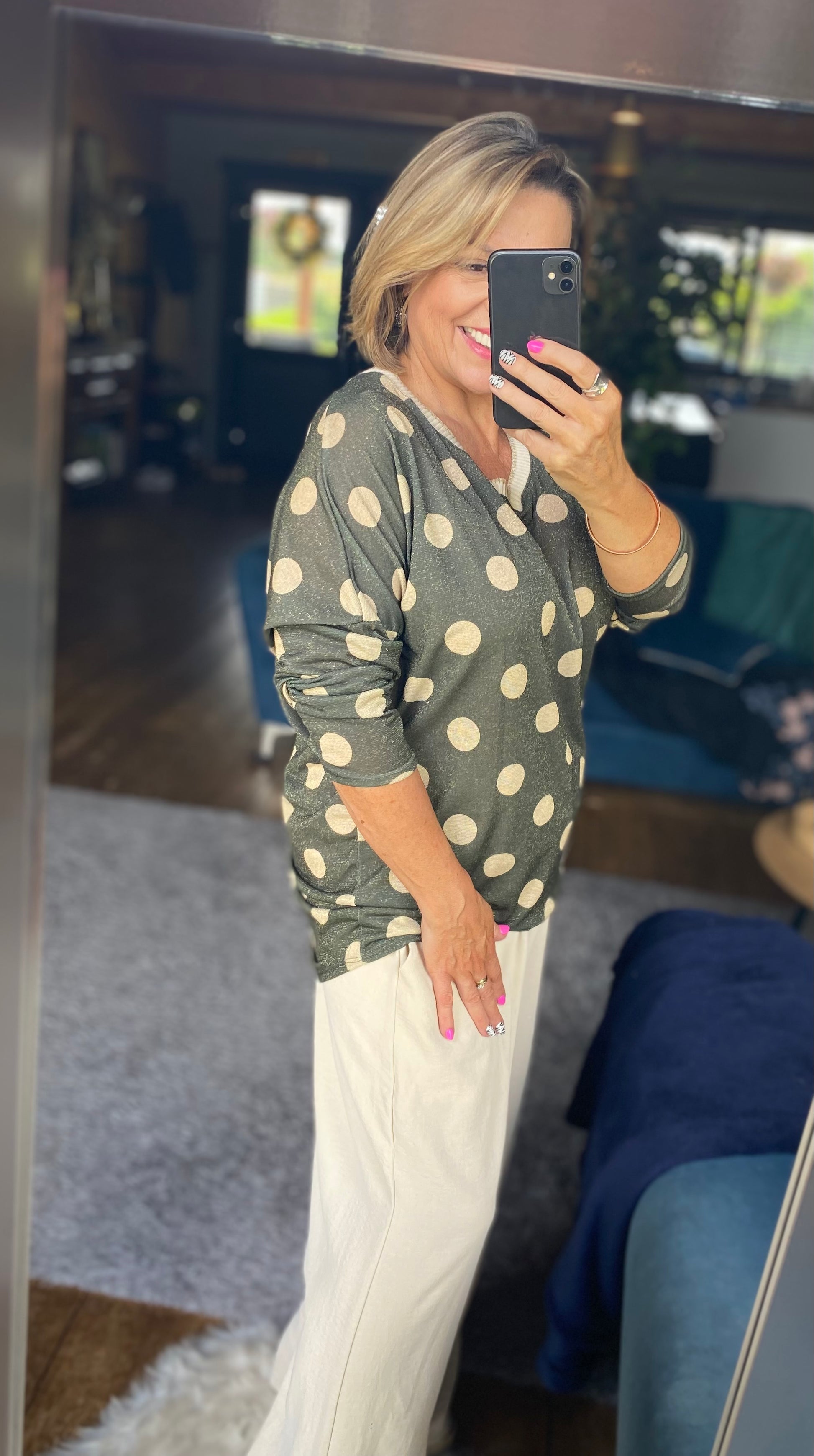 ONE SIZE 10-16. This Lurex jumper brings a touch of sparkle to your wardrobe with its polka dot design and three elegant colour options. The stretchy material and v-neck make it comfortable and versatile. Perfect to wear all year round.