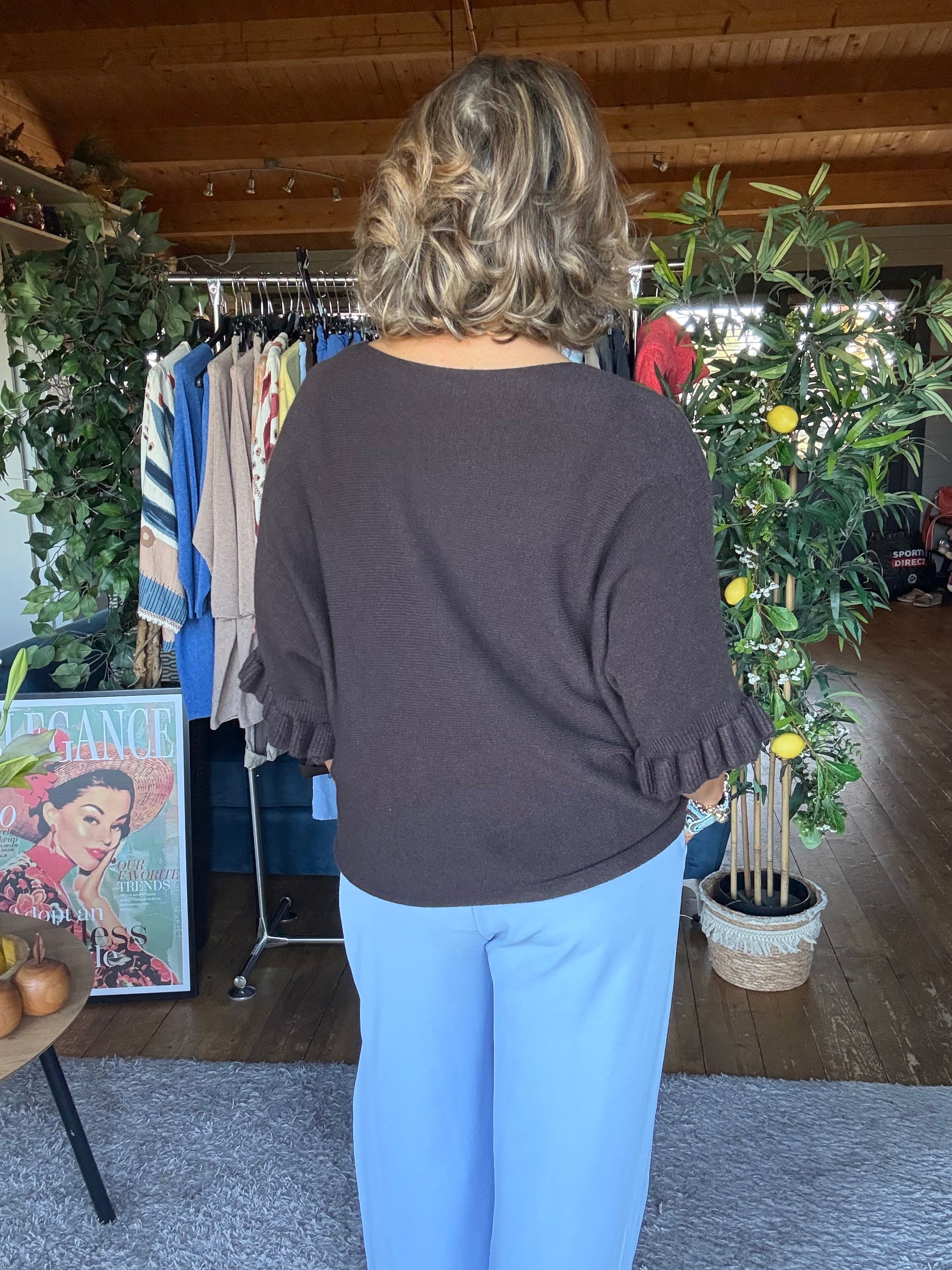 You will love this beautiful knit top with ruffle sleeve detail blending comfort with elegance and it is available in Lemon and chocolate. ONE SIZE 10-16.